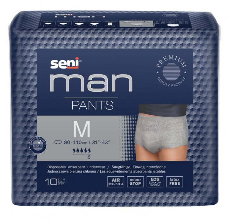 Bielizna chłonna Seni Man Pants powstała z myślą o mężczyznach, którzy cenią komfort i dyskrecję nawet przy problemie lekkiej lub średniej inkontynencji. Produkt wygląda jak klasyczna bielizna, lecz jednocześnie zapewnia skuteczną ochronę oraz suchość – co pozwala zachować pewność siebie w codziennym funkcjonowaniu.