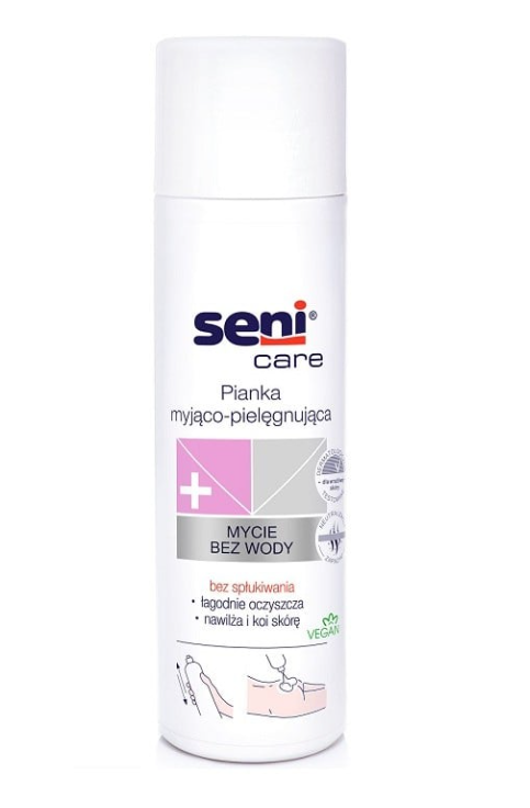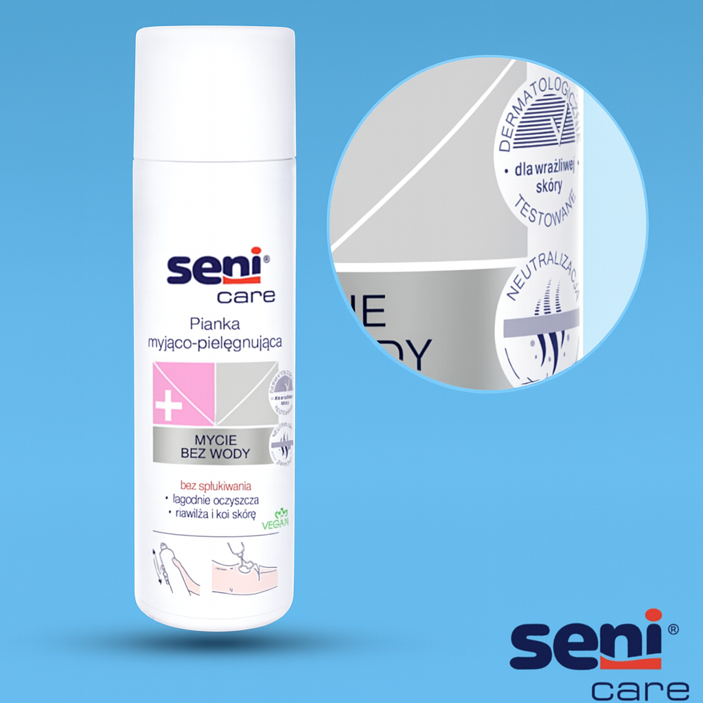 Pianka myjąco-pielęgnująca Seni Care 500 ml zapewnia skuteczne oczyszczenie i pielęgnację skóry — bez konieczności użycia wody. Doskonała dla osób starszych, leżących lub z ograniczoną mobilnością.